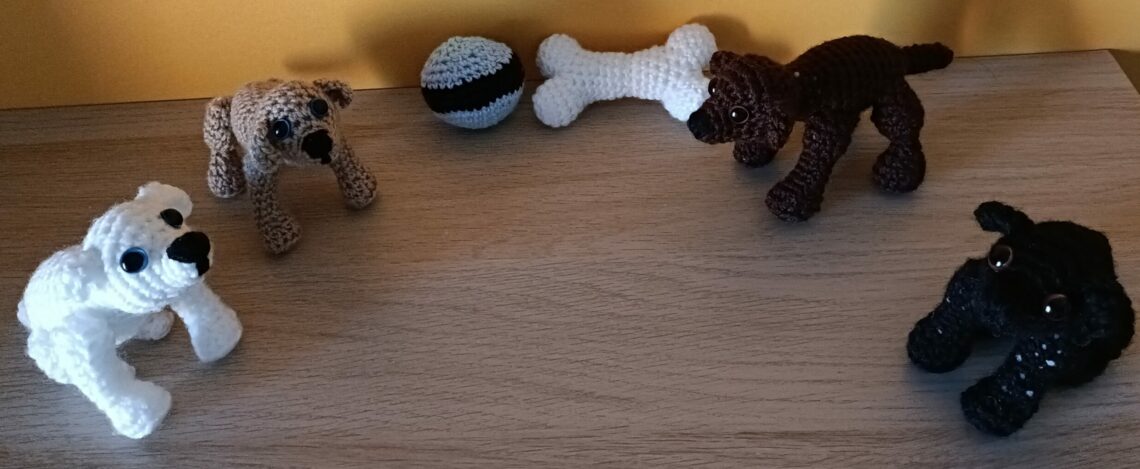 Zostałam zapytana, czy dla fanów labradorków udałoby mi się wykonać psiaki dla nowonarodzonego członka rodziny. Miały być kompaktowe, bo do powieszenia na karuzeli dziecięcej nad łóżeczkiem. Najpierw powstał beżowy, dla sprawdzenia proporcji tworzonego wzoru. Stojąc prezentował się dumnie, więc do niego dołączył czekoladowy. Potem kolejne dwa biały i czarny, zaprezentowały, jak to dumnie umieją siedzieć. Oczywiście bez zabawek to nie zabawa 😉 No i w końcu rodzinka była w komplecie: