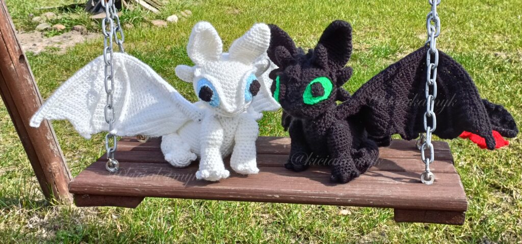 Smoki, smoczki… Jakoś temat tych fantastycznych stworzeń zawsze był bliski mojemu sercu. Stworzyłam ich sporo i będę się tu dzielić zdjęciami. Na początek znane dzieciom i nie tylko smoki z bajki. Wzór jest tworzony prawie w całości autorsko, skrzydła @craftyintensions.